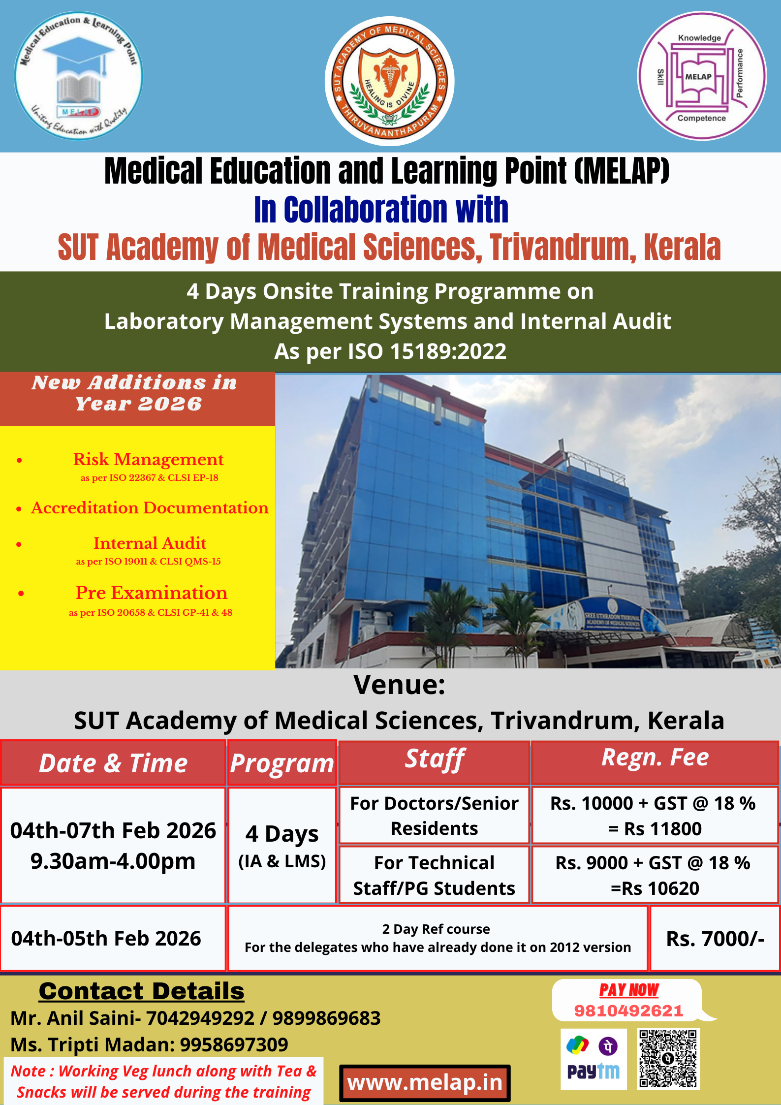 | Professional designation | For Doctors/Senior resident, For Technical Staff/PGs/Students, 2 Days Refresher Course as per ISO15189:2022 |