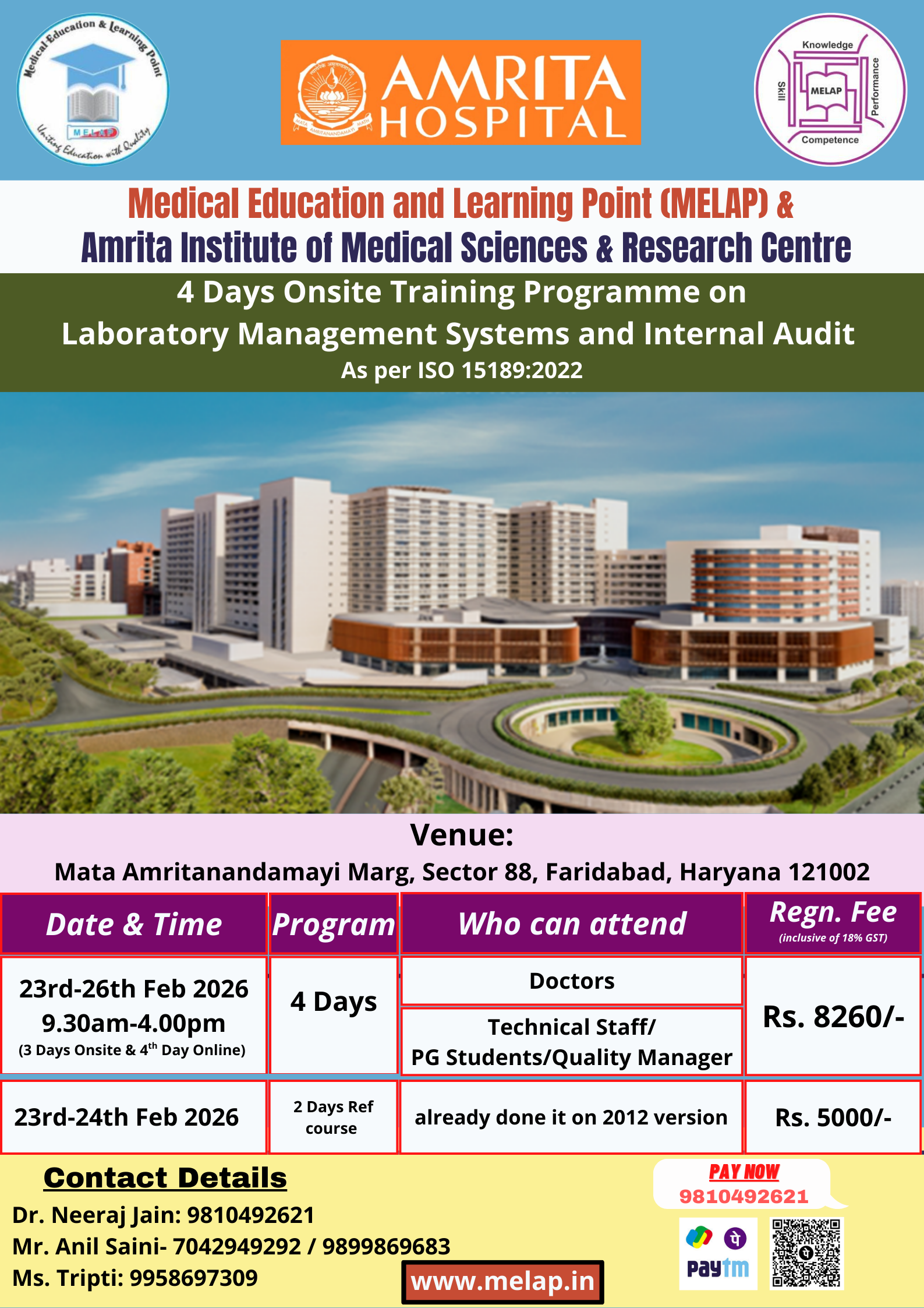 | Professional designation | For Doctors/Senior resident/Technical Staff/PGs Students/Quality managers, 2 Days Refresher Course as per ISO15189:2022 |