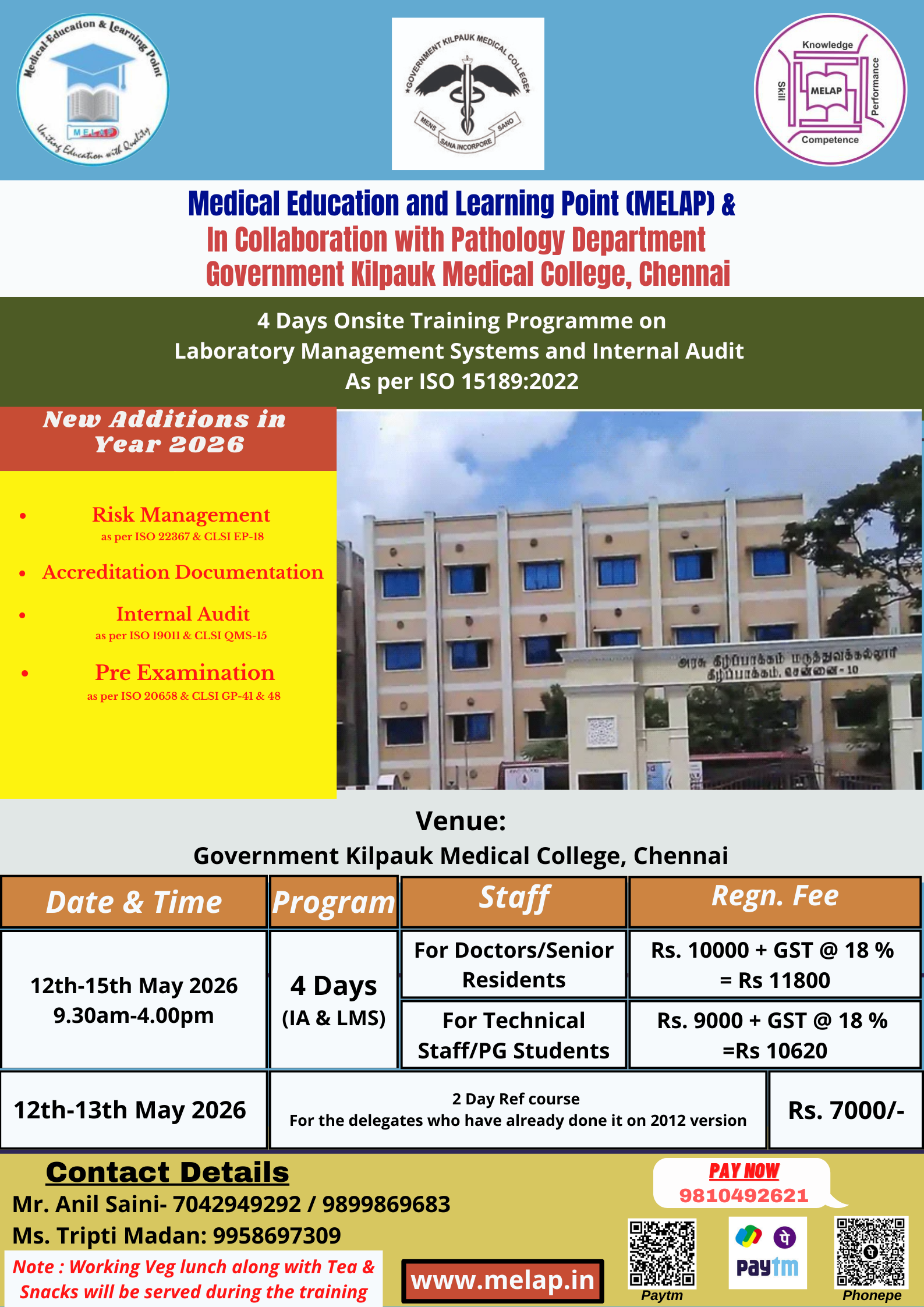 | Professional designation | For Doctors/Senior resident, For Technical Staff/PGs/Students, 2 Days Refresher Course as per ISO15189:2022 |